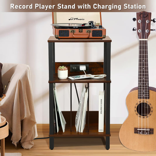 Record Player Stand with Charging Station, 3 Tier End Table with Vinyl Record...