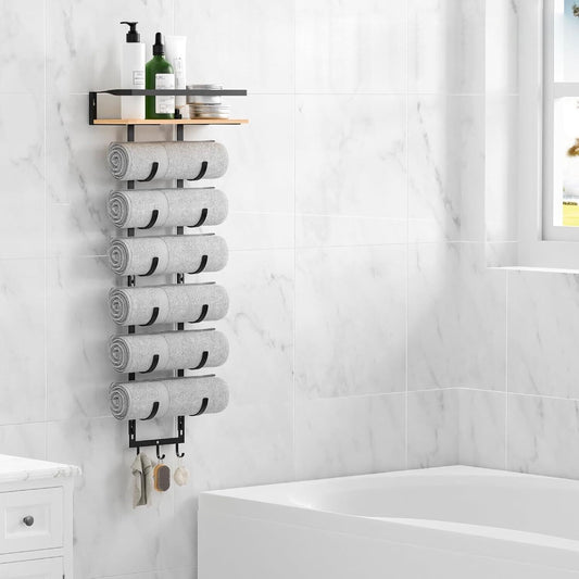 Towel Racks for Rolled Towels - Wall Mounted Bathroom Towel Holder with Wood Shelf & 3 Hooks,...