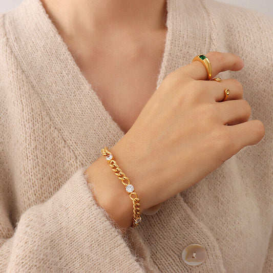 18K Gold Plated Cuban Bracelet Women's Adjustable CZ Curb Chain Bangle, Waterproof Stainless ...
