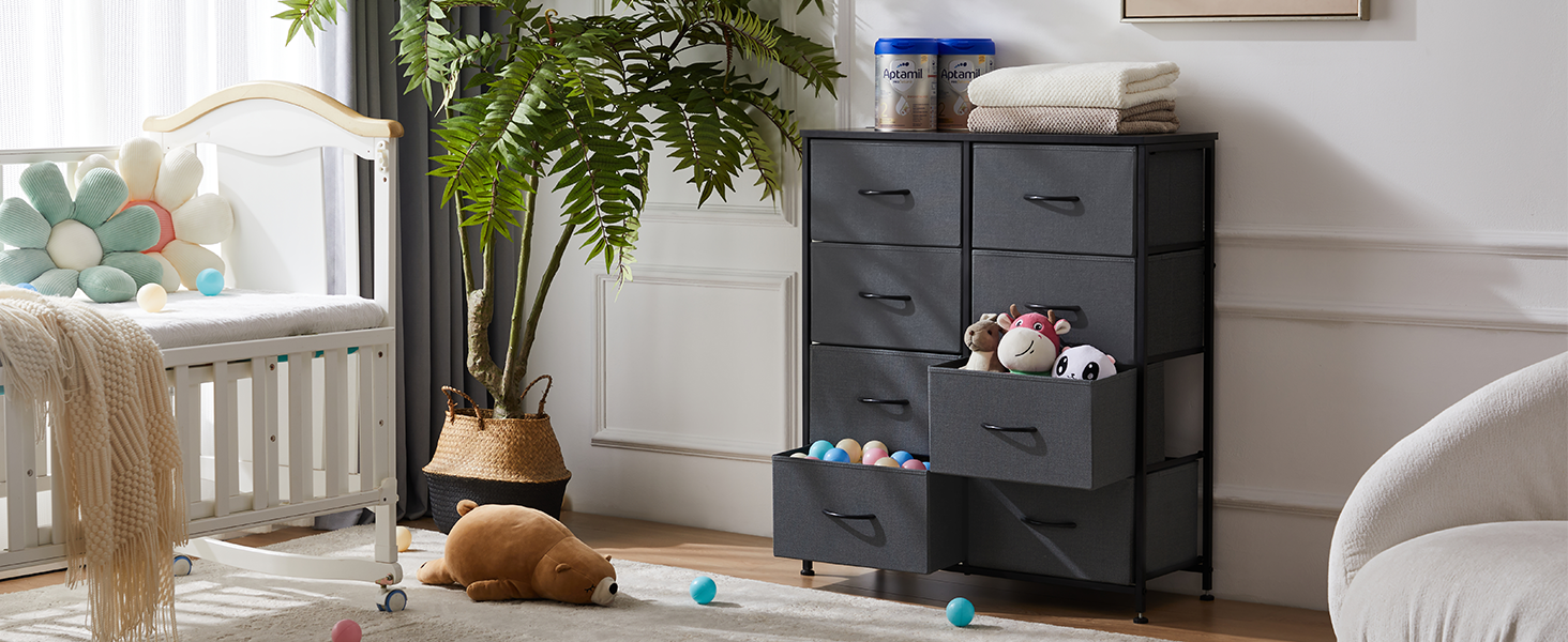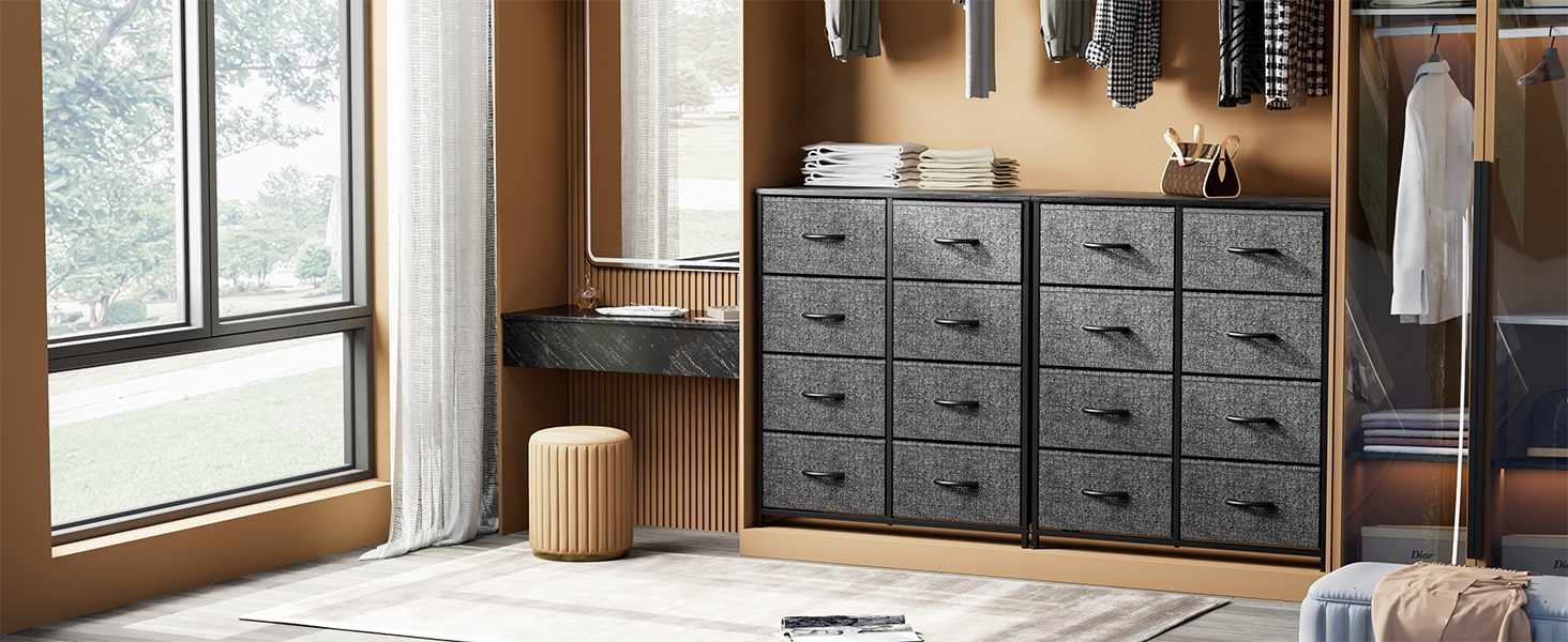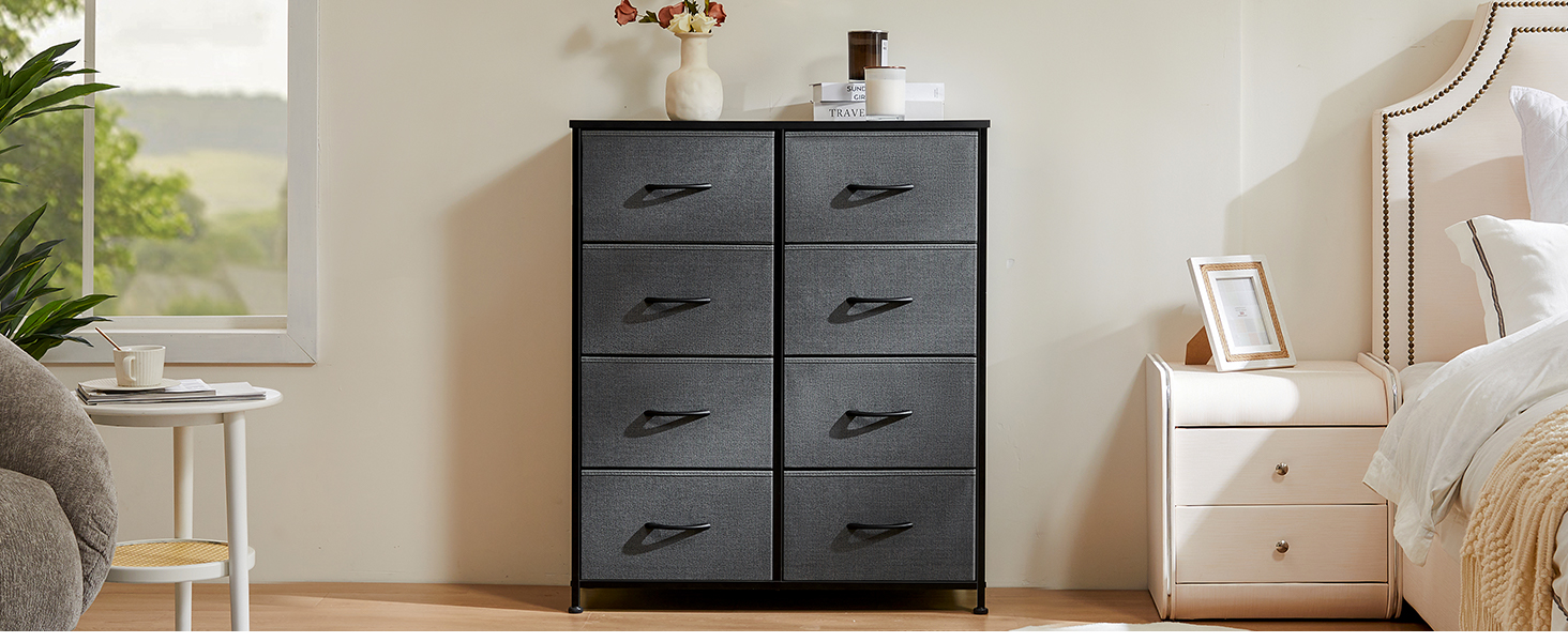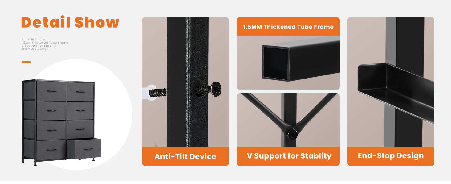 This fabric dresser combines water-resistant MDF board with a durable steel frame. A cross stable structure to make it sturdy under load 66lb. Anti-tipping accessories are also equipped to prevent accidents. With 4 adjustable feet, you won’t have to worry about stability, and it is also adaptable to different spaces. Use stylish storage organizers to find endless organizational possibilities. Just place this clothing storage in the closet to offer a home for workout gear, blankets; place it in the nursery as a kids dresser or baby dresser to store baby clothes and baby stuff; place it in the entryway for storage saving unit for frequently used items. 8 drawers are offered to satisfy various storage needs. The wooden top is great for keeping the most-used items within your reach. With plentiful space to organize all your belongings, your room will always be kept in perfect order. This bedroom dresser is made of cationic materials, all other sides and gaps are made of high-quality breathable and non-woven synthetic fiber, harmless and wear-resistant, suitable for kids, teens and adults. Easy-pull drawers for smooth sliding and closing. For easy cleaning, just wipe with damp cloth and get it air-dried.