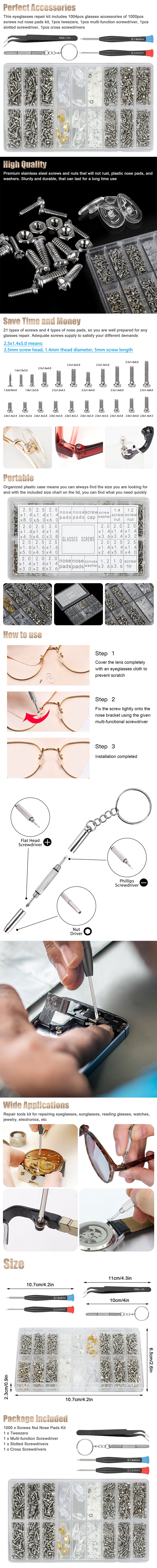 ✨ Save Time: glasses to repair with 21 types of screws and 4 types of nose pads including tweezers, multi-function screwdrivers, slotted screwdrivers, and cross screwdrivers. Good screws supply to satisfy your different demands.