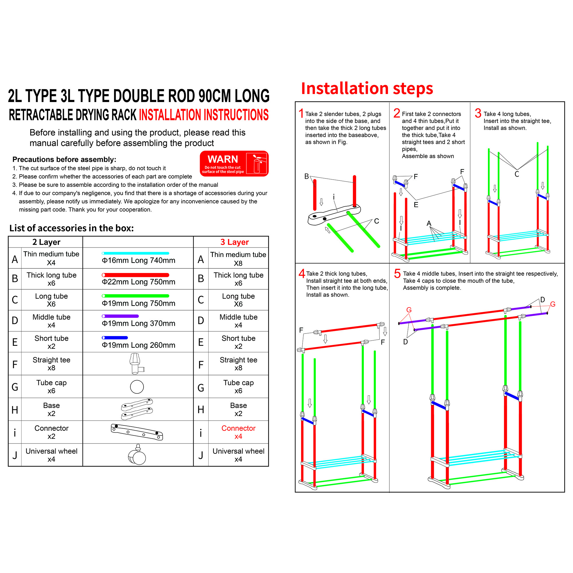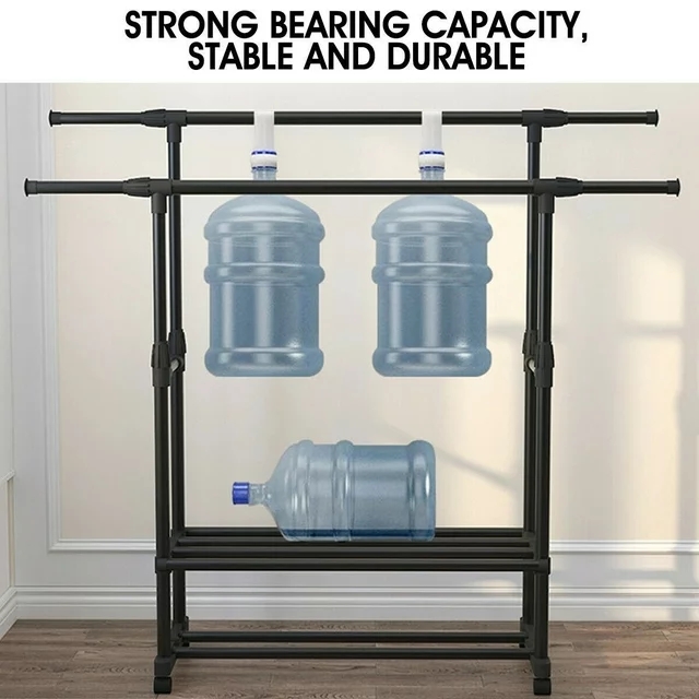Please consider clearly before placing an order, the load-bearing capacity of this product is limited, only suitable for some light clothes, like summer clothes, winter clothes are not recommended to put more Tips: *Please read the instruction carefully or refer to the installation method in the video before assembling. *lf the goods are damaged or missing parts, please contact us in time to replace the new products, thank you. *Contact us please for whatever we can help. Specification: Type: 2-layer Garment Hanging Rack Color: Black Material: Steel-plastic composites pipe + ABS joints Size: As Picture Shows Size: *Slender long tube X2: Φ19mm; Long 750mm *Thick long tube X6: Φ25mm; Long 750mm *Long tube X4: Φ22mm; Long 750mm *Middle tube X4: Φ22mm; Long 370mm *Thin middle tube X4: Φ16mm; Long 740mm *Short tube X2: Φ22mm; Long 260mm *Straight tee X8 *Tube cap X6 *Base X2 *Connector X2 *Universal wheel x4 Installation steps: 1. Take 2 slender tubes, 2 plugs into the side of the base, and then take the thick 2 long tubes inserted into the baseabove. 2. First take 2 connectors and 4 thin tubes, put it together and put it into the thick tube, take 4 straight tees and 2 short pipes. 3. Take 4 long tubes, insert into the straight tee. 4. Take 2 thick long tubes, install straight tee at both ends. Then insert it into the long tube. 5. Take 4 middle tubes, insert into the straight tee respectively, take 4 caps to close the mouth of the tube. Assembly is completed. Feature: 【Extra Storage】Double pole design, there are 2 poles for hanging, and you can adjustable the length and height according to your needs. The bottom shelf provides extra space for putting boxes, shoes, boots, pants, etc. And putting stuff in this area will help stabilize the coat rack. 【Movable Wheels】The clothes hanger is equipped with 4 wheels making it easy for you to move this garment rack from your bedroom to your coatroom. 2 of the wheels are equipped with brake pads to lock it in place as you need. 【Easy to Assemble and Clean】Simple installation. The coat rack can be quickly assembled with the parts provided according to the detailed instruction. Simply wipe with a cloth to clean the surface of the rack. 【Wide Range of Uses】The clothes hanger can not only hang clothes, scarves and dresses, but also place shoes and storage boxes at the bottom. It is suitable for any place in your home without occupying too much space, whether bedroom, balcony, hallway, laundry room, entryway or closet. 【Great Service】lf you have any questions about the product, please feel free to contact us by email, communication is often easier to solve the problem! -Equipped with removable pulleys, making it easy to move the rack. You can put it anywhere you want. -Made of high-quality material, sturdy composite pipe, which is waterproof, not easy to rust and durable. -With strong bearing capacity, it is eco-friendly, stable and has no odor. -Telescopic design, adjustable length and height, not limited by space, applicable to a variety of scenarios. Package Content: -1*Coat Rack Note: 1. lf you have any idea of return or exchange, please feel free to contact us by email, communication is often easier to solve the problem than return and negative comments! 2. The picture may be a little different from that of real item due to the different display and different light. 3. Due to different producing batches, product details might be a little different. If you mind the difference, please buy with caution. Thank you for your understanding. 4. Please allow minor differs due to manual measurement. Note: This item starts garment rack with 2 layer shoe racks after 2024.6.10,Thank you for your understanding and wish you a satisfying shopping experience. Heavy Duty Clothing Garment Rack Rolling Clothes Organizer Double Rails Hanging
