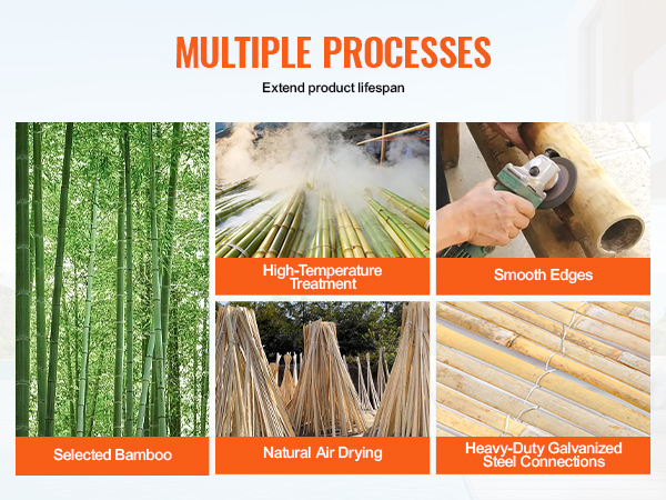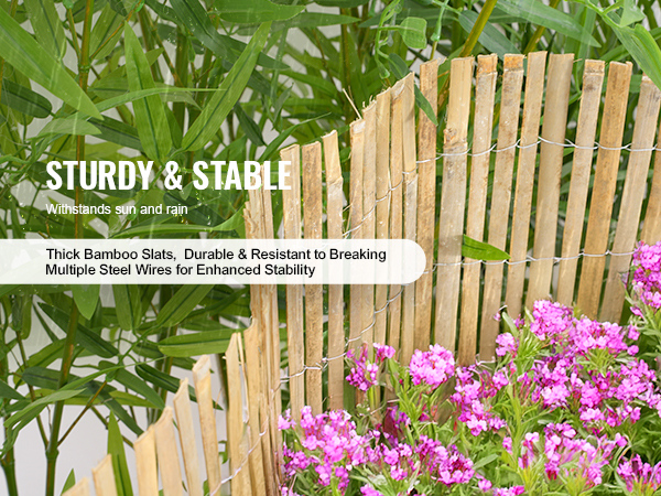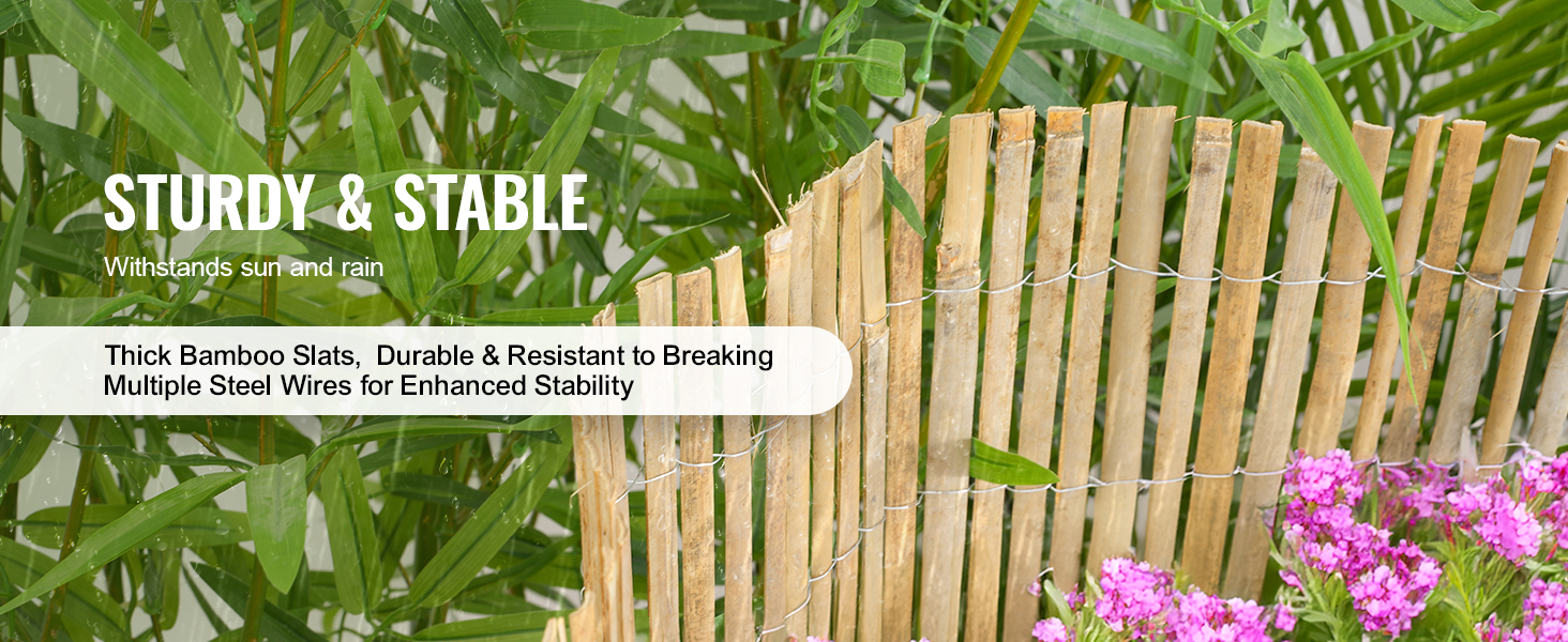 Sturdy and Durable: Each bamboo slat fence piece is secured with heavy-duty galvanized steel wire, ensuring rust resistance and overall strength. The bamboo undergoes heat treatment to enhance its waterproof feature, extending its lifespan. Embrace green living!