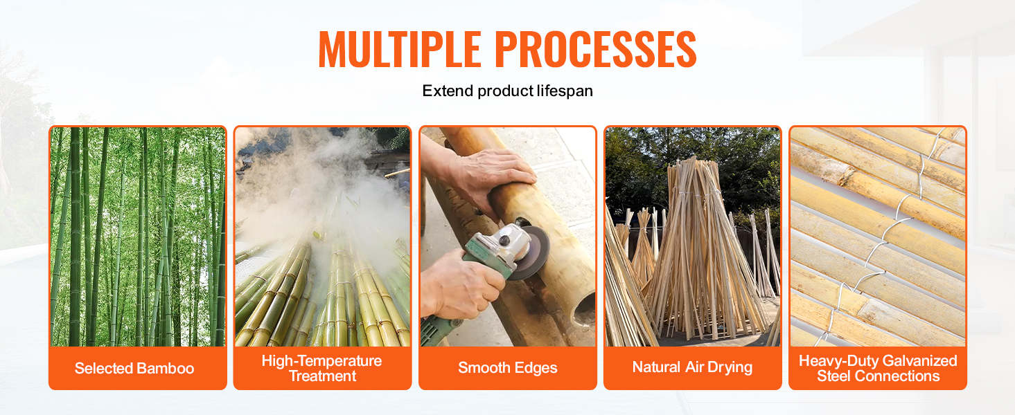 Each bamboo pole undergoes traditional treatments including high-temperature steaming, washing, and natural drying. Connected with thick galvanized steel wires, the bamboo fence is rust-proof and ensures a sturdy structure, extending its lifespan.