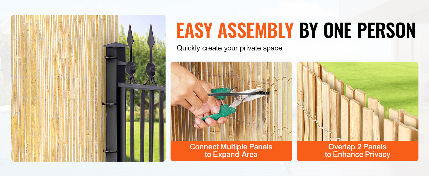 Simply open the package and install the bamboo wall with the fasteners (such as zip ties or wire). Quick to set up on flat or curved surfaces, and can be connected or overlapped for larger or more secure and private installations.