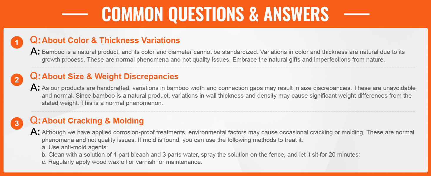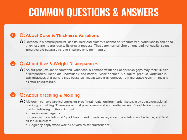 Use Tips: As a natural product, each bamboo piece is unique, so color and diameter may vary. For outdoor use, we recommend regularly applying a layer of linseed oil or sealant to maintain the natural bamboo slat fencing's appearance.