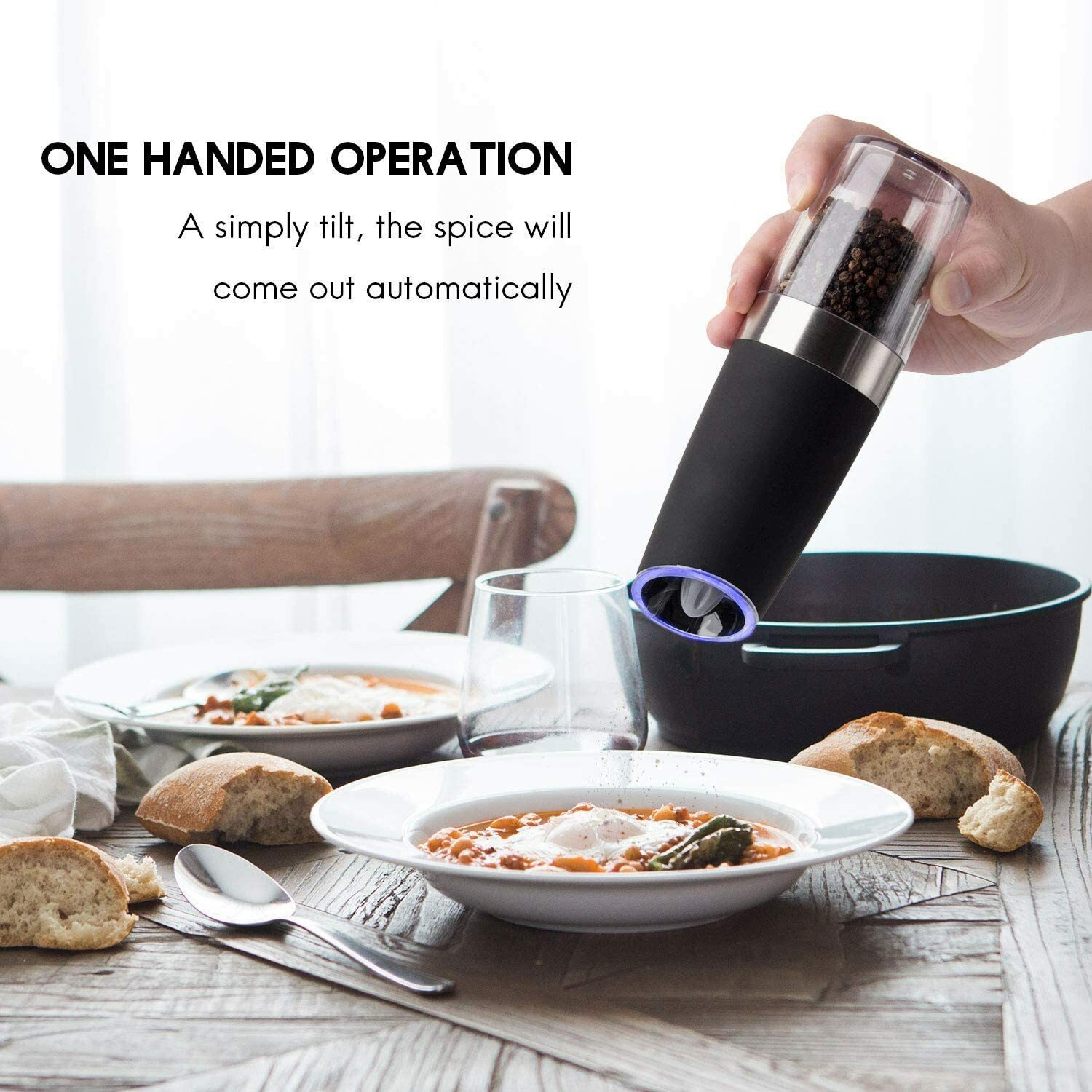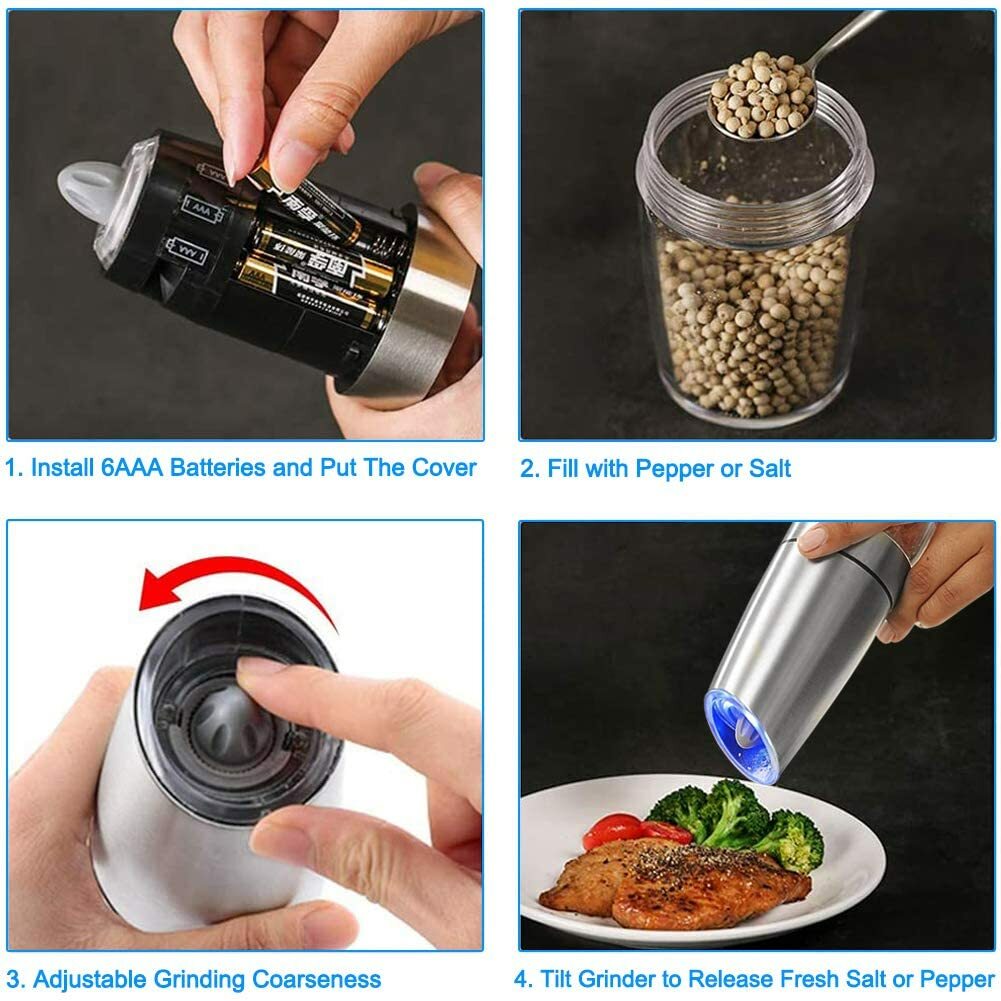 Product Description Brand Unbranded Number of Items in Set 1 Power Source Battery Size Medium MPN Does Not Apply Making Method Rock Salt Style Modern Features Adjustable Coarseness,Automatic,Electric Set Includes Pepper Mill/Grinder,Salt Mill/Grinder Material Stainless Steel Type Electric Grinder/Mill Country/Region of Manufacture China 100% Brand new and high quality! Feature: 1,Large Application: grind black pepper, white pepper, sea salt,grind meat ,beef ,grind spice soybean and other solid granules. 2,Simple Operation: simply tilt to automatically activate the spice grinder,the blue LED light will turn on automatically 3,Adjustable Coarseness: adjust the top adjuster to grind your pepper corns and sea salt or meat beef soybean with fine to coarse 4,Battery Powered: 6 AAA batteries powered,no buttons to press or manual grinding.(Batteries not included) 5,High quality & large capacity:High quality acrylic material, Non-corrosive and antioxidative, makes spices fresh and healthy. large capacity and easy to refill, Simple and fashion design, suitable for all dinner tables and kitchen counter tops. Instruction and Battery Installation: 1,Unsrew the upper cap with anti-clockwise direction and remove it from the body. 2,Fill 6XAAA batteries into the battery compartment as per the picture showing 3,Put the upper cap back to the body and turn it to fixt with clockwise direction Fill The Spice : 1, Unscrew the ower part of transparent chamber with clockwise direction and remove it from the body 2, Fill the pepper corns or sea salt into the chamber. don't over fill. keep the pepper corns or sea salt 80% full in the chamber as maximum limit. 3, Replace the chamber to the body and unscrew it to fix Operating Your Pepper Mill: 1,Turn it over your gravity pepper mill to start working. The blue LED light will turn on automatically, no buttons to press or manual grinding 2,Adjust the top adjuster to grind your pepper corns or sea salt with fine to coarse Material: Stainless Steel body & Acrylic chamber Color: Black Package Weight: 0.35kg/0.77lb Size: 2.8*2.8*8.3 in Note: Always keep clean and avoid contacting with water Package Includes: 1 x Niceshop Salt & Pepper Mills (battery not include) 1 x Instruction Manual 1. We accept refund or return within 30-day since item delivered. 1.We ship to your eBay or Paypal address. Please make sure your eBay and Paypal address is correct before you pay. 1. Please leave positive 2. Please contact us if you have any questions before or after purchase. About usStore Categories