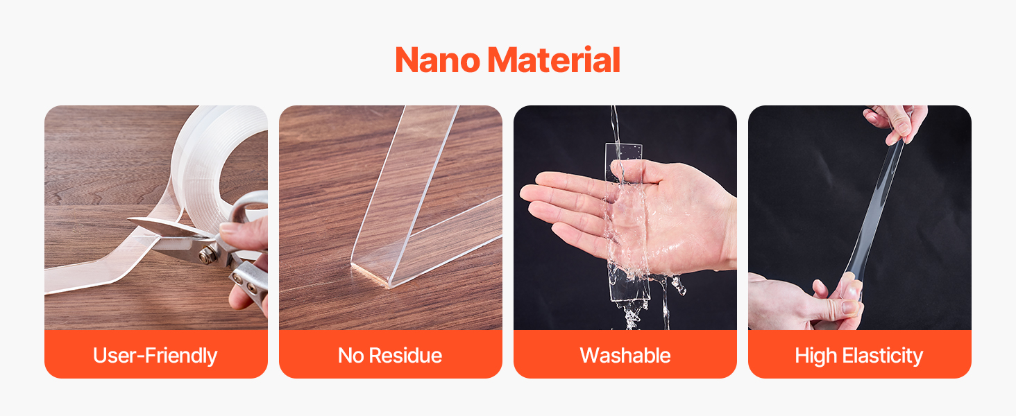 No Residue: Made from nanomaterials, this sticky tape ensures no sticky residue is left behind when removed. It also has excellent flexibility, making it durable and convenient for multiple uses.