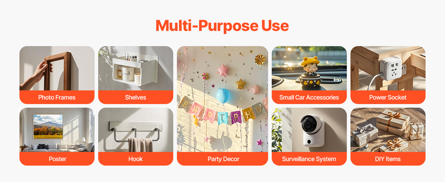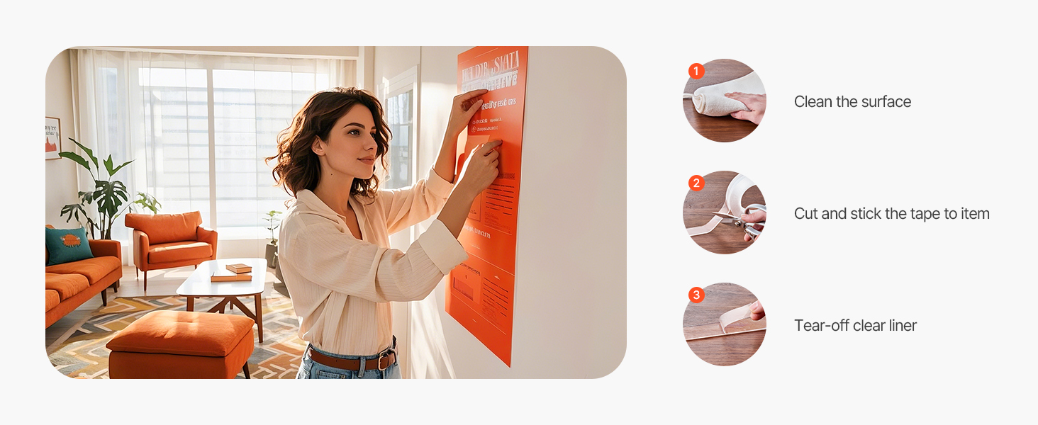Easy to Use: This clear two sided wall tape is simple to apply—just clean the surface, cut the tape to size, and peel off the transparent film. It’s designed for easy handling by anyone.