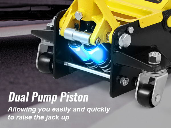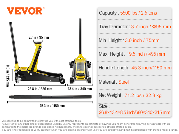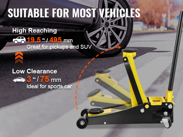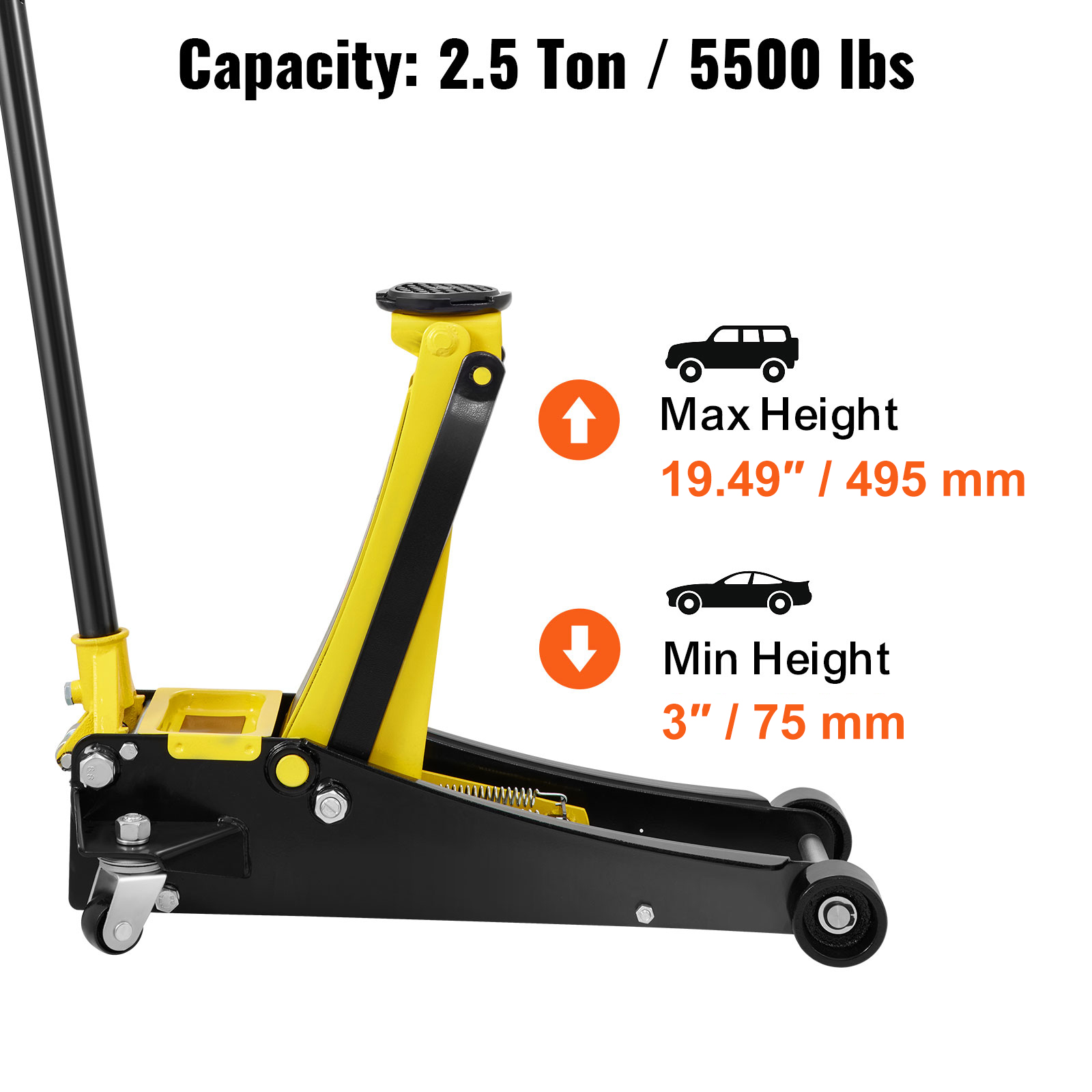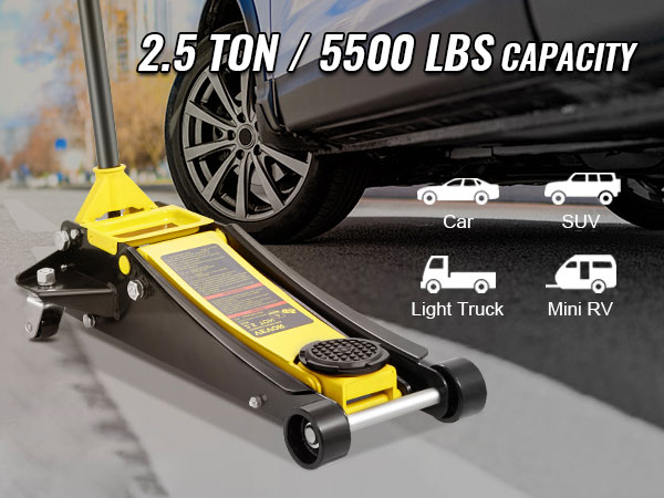 Jack it Up: With 2.5 tons/5500 lbs strong loading capacity, VEVOR's floor jack can help you raise your car for whatever reason. Replace a tire, change oil or maintain the brake, whether you are a professional, car enthusiast, or weekend DIYer to take matters into your own hands!
