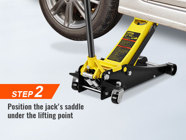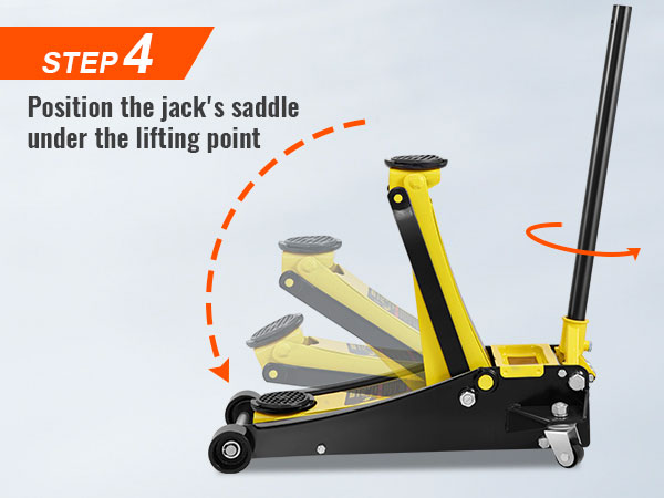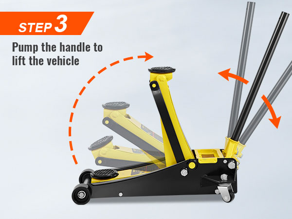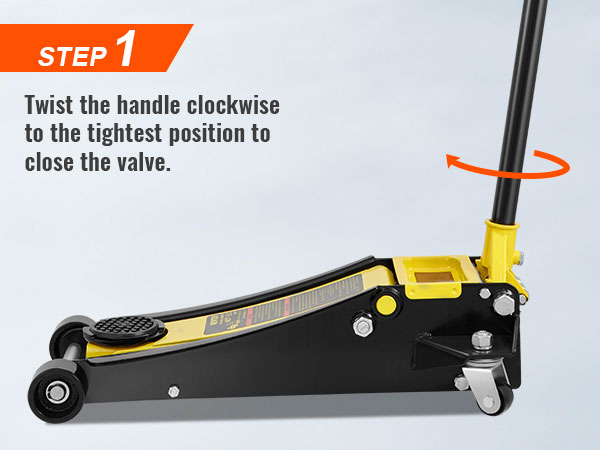 Twist the handle clockwise to the tightest position to close the valve; place the jack's saddle under the lifting point; pump the handle to lift the vehicle. Last, slowly twist the handle counterclockwise to lower the jack.